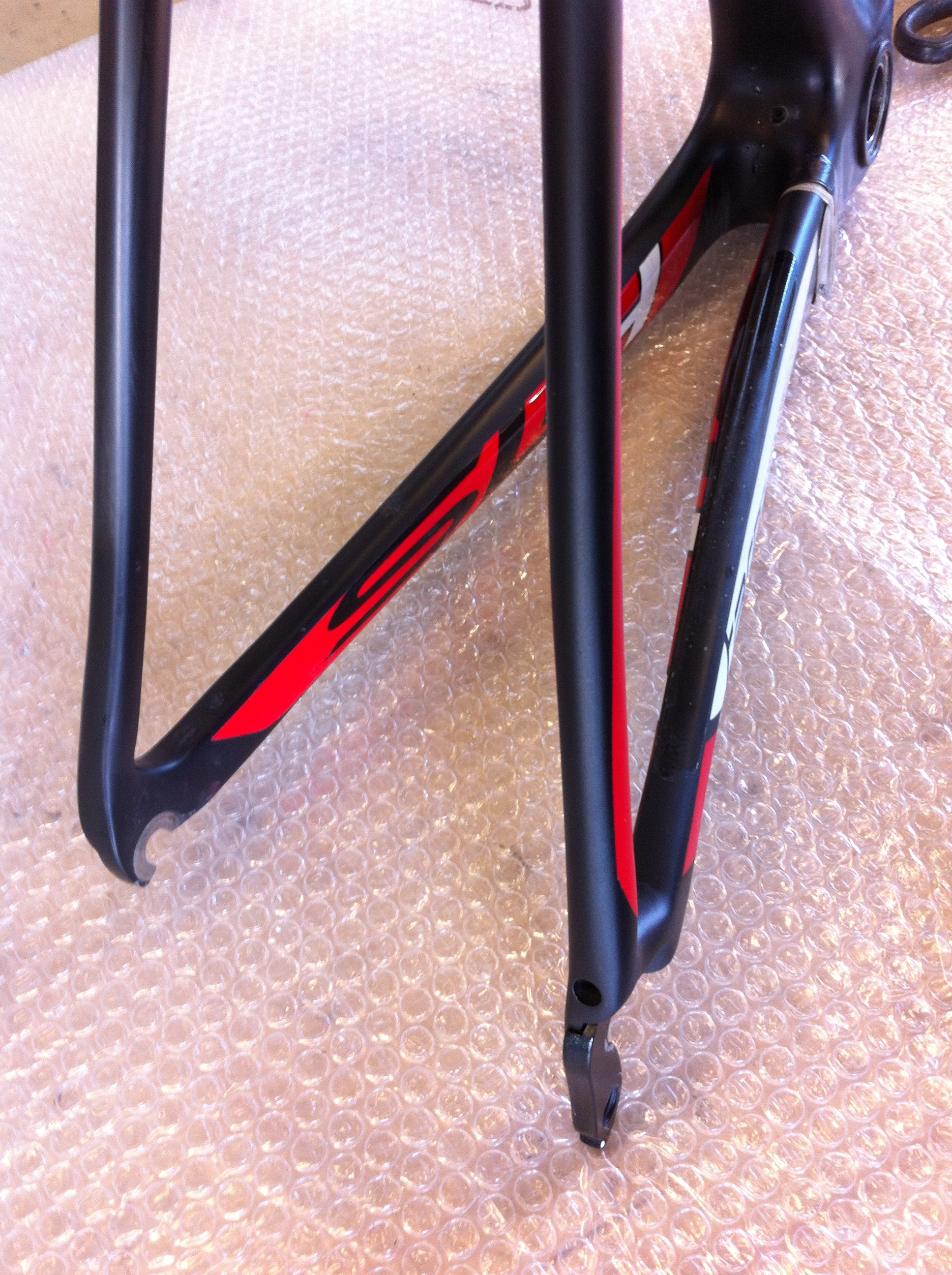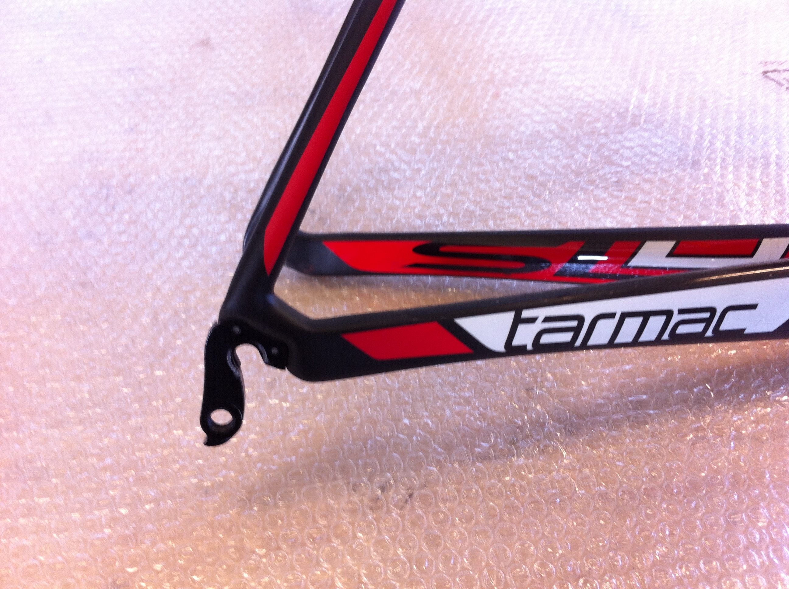 Per la seconda volta in poco più di un mese questa sfortunata Specialized è tornata sotto i ferri del Doktorbike. La prima volta la riparazione è stata effettuata su una grave frattura del tubo obliquo, prodottasi in seguito a una caduta. La seconda volta, come si vede nella prima foto, il problema era sul fodero destro alto, praticamente spezzato a causa di un incidente in gara, il pezzo di fodero non è stato più neppure trovato. Ricostruire ex novo tutta la parte mancante è stato possibile usando come anima interna il termanto (PVC espanso), fasciato successivamente con fibre di carbonio UD a modulo intermedio. A riparazione finita il fodero risulta probabilmente più resistente dell'originale (grazie all'anima interna prima assente) a fronte di un aumento di peso insignificante, 5-6 gr. Il lavoro è stato terminato ripristinando le grafiche e la verniciatura originaria e il risultato è visibile nelle foto qui sotto.