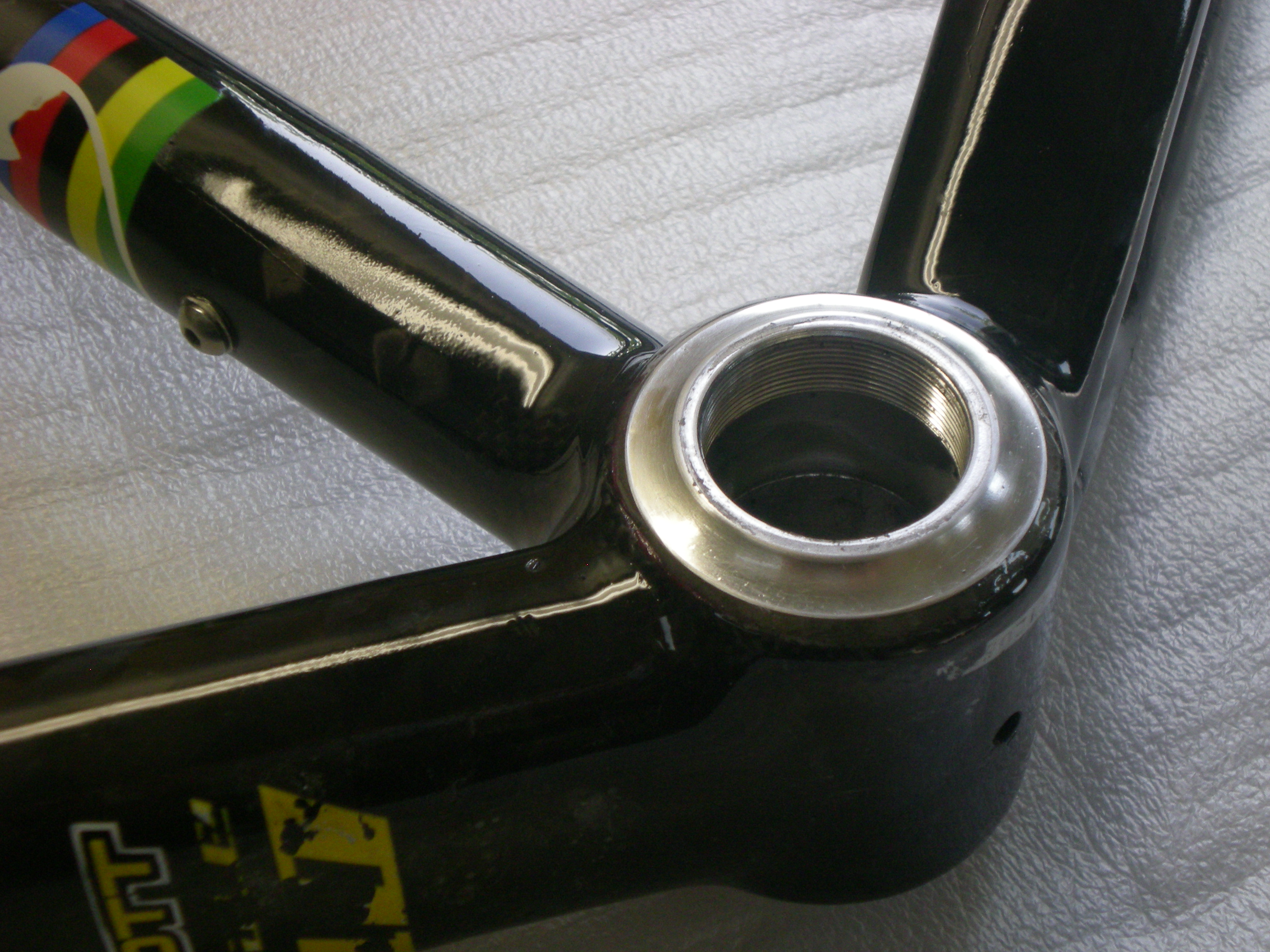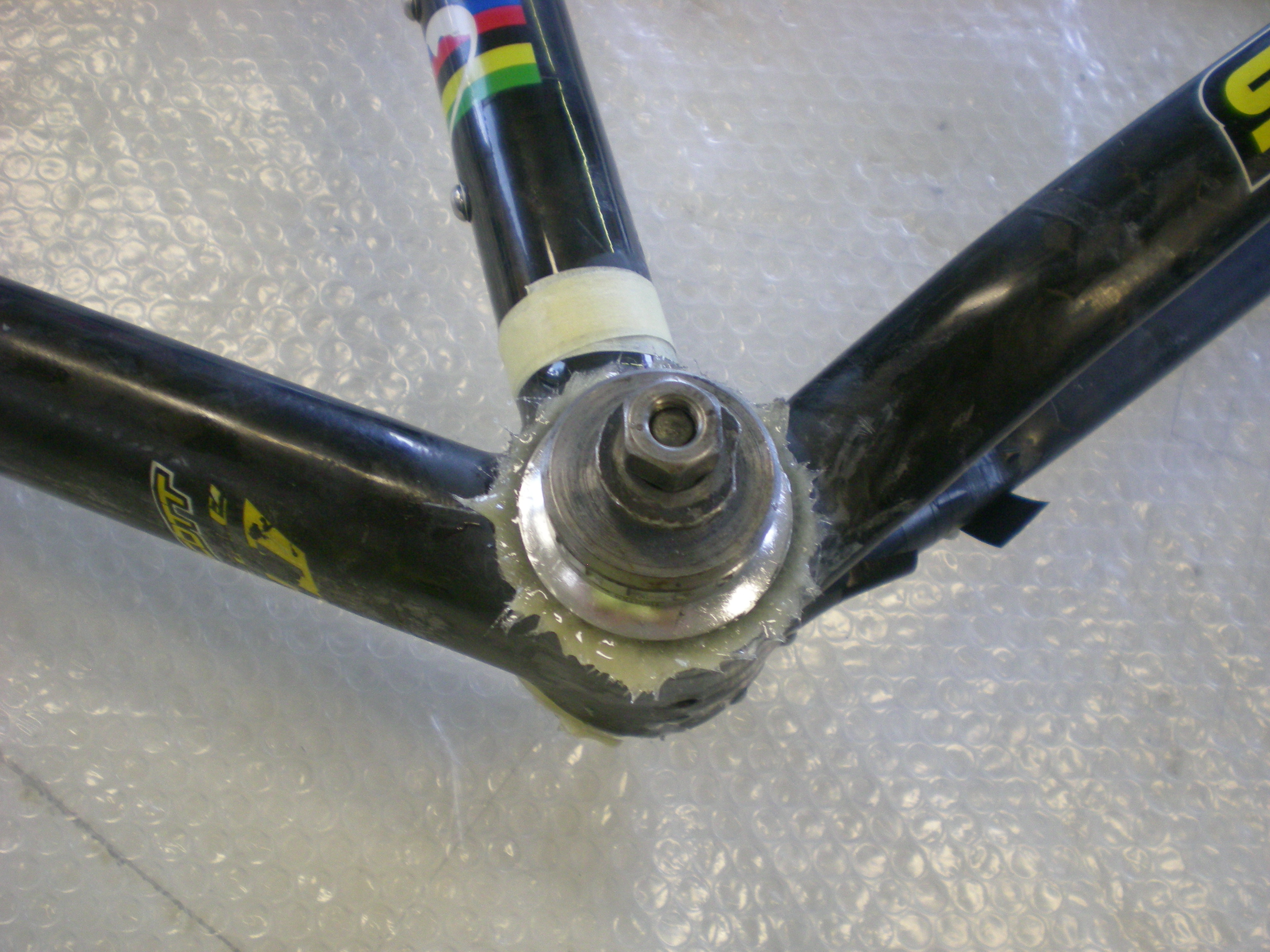 Molto spesso nel lungo periodo, l'incollaggio carbonio-alluminio presenta problemi, anche nelle migliori marche di biciclette. Ne è un esempio questo telaio di una Scott Scale a cui si è scollata la bussola del movimento centrale. Doktor Bike può comunque ripararlo impiegando una tecnica specifica, da lui stesso sviluppata e testata negli anni.