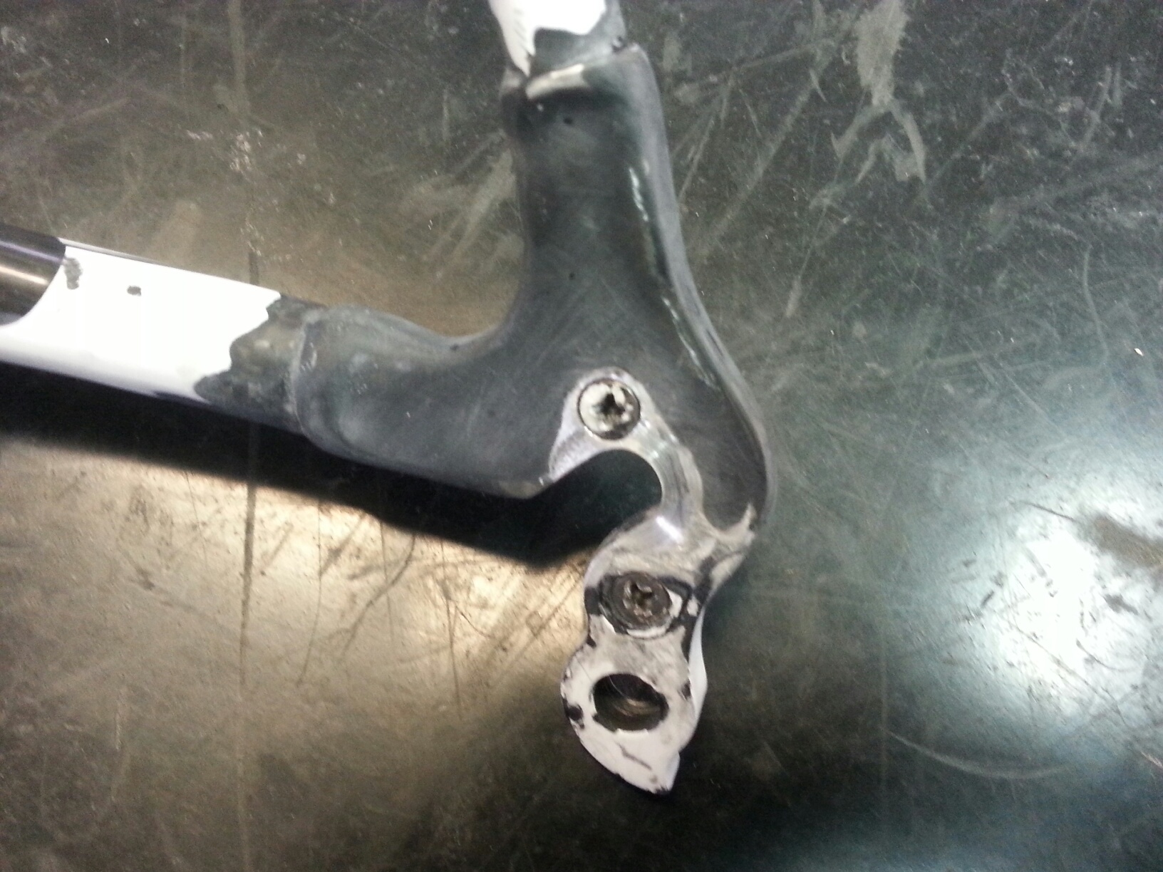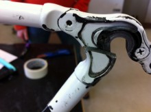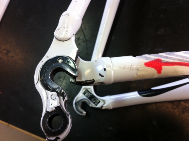 La riparazione è sicura e l'effetto visivo gradevole, nelle foto si può vedere il forcellino spezzato e lo stesso fasciato, manca ancora la fase di verniciatura che riporterà il telaio all'aspetto originale.