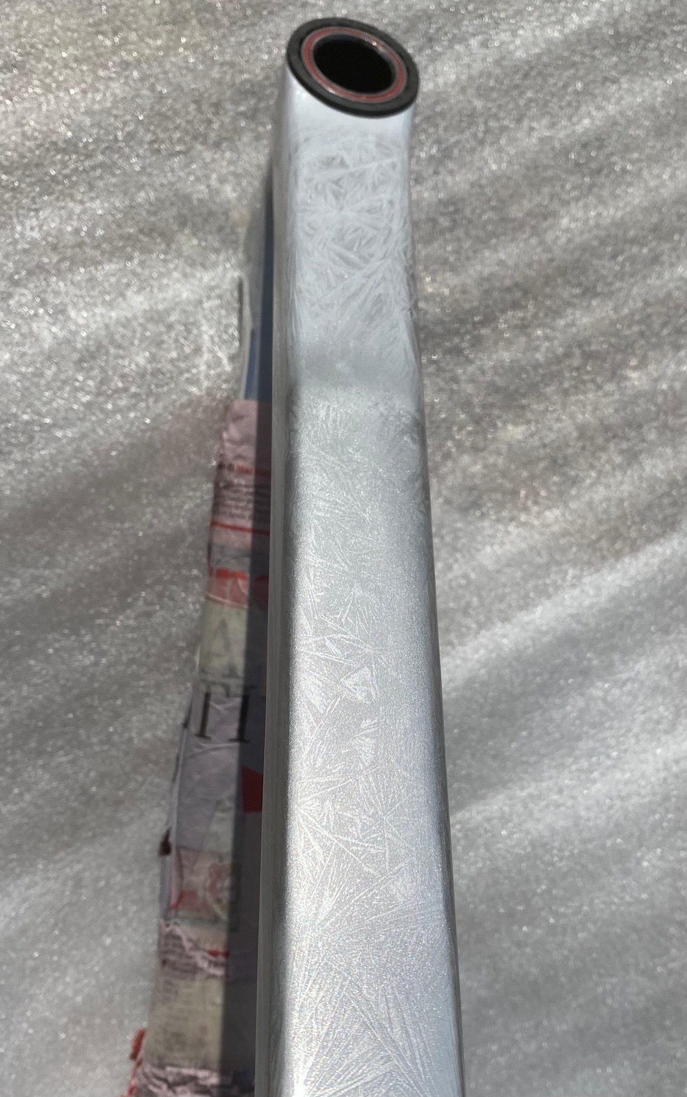 Per ripristinare la colorazione di questo telaio, che era lesionato sul tubo orizzontale, è stato necessario un metodo particolare, per far cristallizzare lo strato sottostante di vernice e far ricomparire il pattern a forma di cristalli sullo strato superficiale